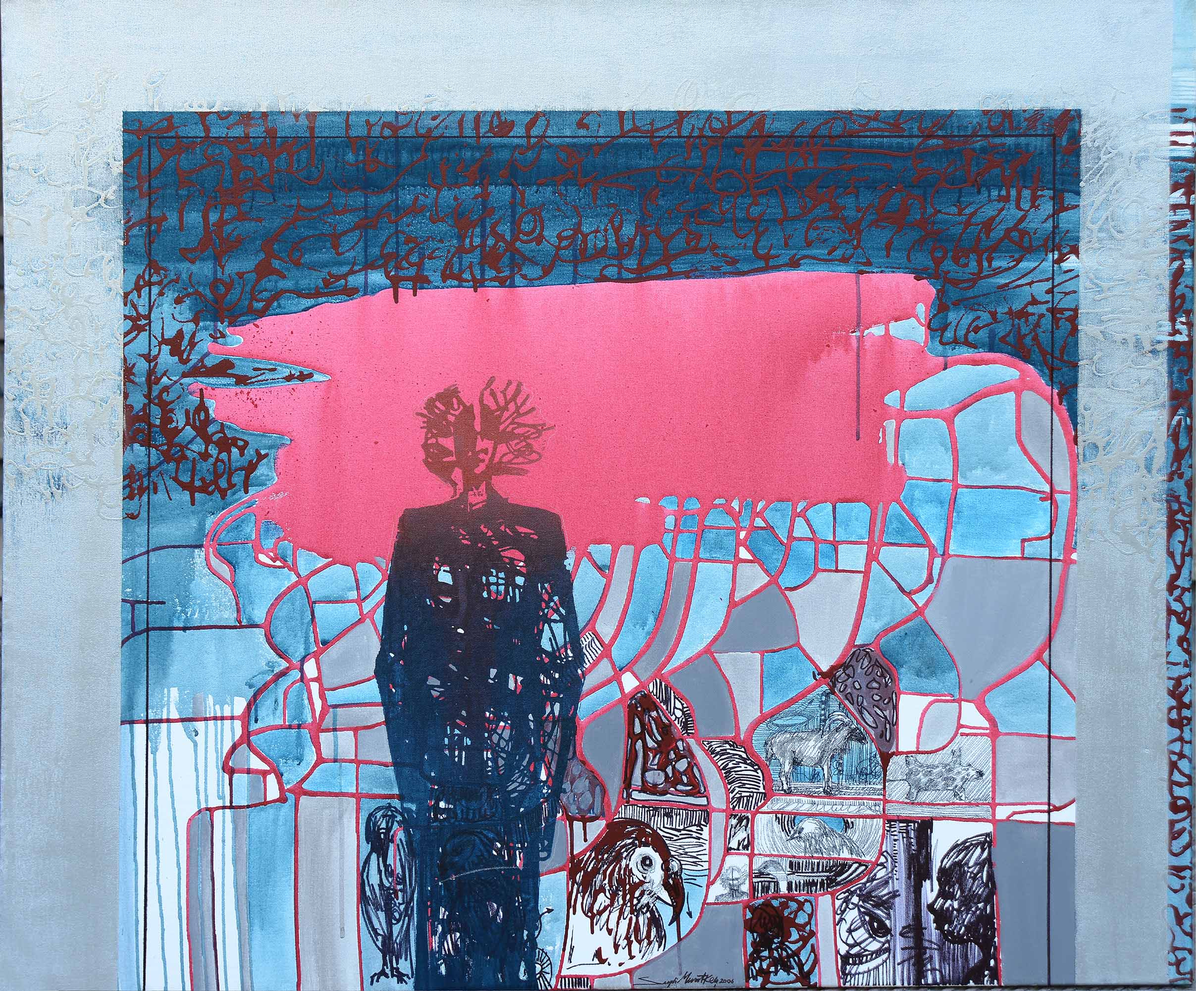 Tablolar ve Kırmızı Levhalar, 2006, Tuval üzerine karışık teknik- Mixed media on canvas, 100×120 cm.